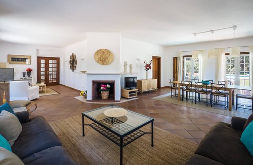 A spacious entrance hall, full of light. The front door gives access to the terrace, the garden and the pool. On the terrace, a table that comfortably seats 12 people and a barbecue where we can cook very healthy meals. The grass makes a soft and comfortable separation from the pool area, where we find restful sun loungers and umbrella protectors. In the hall, the first door on the right leads us to the very comfortable and fantastic room in "L" - in the beginning, a sofa for two people and a comfortable armchair. It is the ideal space to read, relax or watch television with numerous international channels. Further ahead, two huge sofas, set "in the corner" facing a lovely fireplace to warm us up on winter days. The following is a dining table that seats up to 10 people easily. A direct access door to the kitchen. The front doors, facing the garden and pool, convey the luminosity and tranquility of this area.
