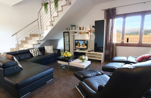 Our Villa Eden Son Manyo is located on a quiet piece of land, divided into 4 different properties. Every property on the complex "Son Manyo" is very spacious and offers a lot of privacy by a wonderful solitude. Already the driveway of the 15,000 m² large plot lets you imagine that this is a very modern and comfortable property. The large, well maintained garden is laid out with lawns, typical Mallorcan plants, shrubs and palm trees. From here you can enjoy a wonderful view of the surrounding countryside and the Tramuntana Mountains. The large round, Roman-style swimming pool (11m diameter) offers plenty of space for swimming and refreshing. The pool area is equipped with very comfortable sun loungers, parasols and umbrellas. The beautiful barbecue area is equipped with a reed roof and thus also provides shade and protection during the meal. Space and comfort are also available here. Here, especially good fresh food can be prepared, which was previously obtained at the weekly market or the Butcher in Sa Pobla.