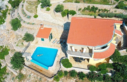 If you want to spend a relaxing holiday, this holiday home is just what you want. The house is located at the very end of a small fishing village, in the first row to the sea. Its location allows you to spend your holiday isolated from the crowds of summer in complete peace surrounded by medicinal herbs. Next to the house is an overflow pool with seawater from which, as well as from the whole garden and the house offers a beautiful panoramic view of the sea and islands, and bathing in it will give you idyllic moments of rest in complete privacy. The garden has a summer kitchen with barbecue, a spacious terrace, trampoline and swings for children and covered parking. Along the sea you will find a spacious stone quay, which also includes an awning covered area with deck chairs, a jumping area and a slide for children, intended only for you. Since there are no larger settlements or industrial facilities in the wider area, the sea is extremely clean and clear, and therefore especially attractive for diving and fishing enthusiasts. If you prefer a day of swimming and sunbathing, fresh fish is still possible as local fishermen will be happy to offer you their daily catch. The location of this house in relation to the natural environment offers lovers of nature walks