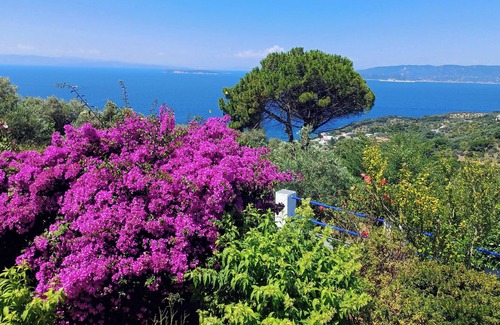 A unique location just off the main road, the property is enclosed with stone walls and wood fencing providing complete privacy. A beautiful wood electric gate leads down the driveway to ample parking space. Nestled in an olive grove with its white washed exterior and blue shuttered windows, VillaView is every inch the Aegean escape. Traditional architecture with modern amenities, new gourmet kitchen is a chefs delight, with high end appliances including wine cooler which stores white, red and champagne. The living area is light and airy with its high beamed ceilings, traditional fire place and large picture window opening out to the olive trees and the sea beyond. All doors and windows screened in allowing cool breezes to filter through. Leave the world behind as you step through the French doors out onto the main terrace. Whether it be morning, noon, or night you can enjoy al fresco dining while admiring the breath taking views of the sea, surrounding islands and the picturesque village of Glossa. New renovated bathrooms with spa rain shower, led lighting and state of the art fixtures. The top terrace offers panoramic sea views, islands in the distance, the village of Glossa and Loutraki harbour. A great place for cocktails while viewing majestic sunsets. The luxury pool is 12 by 4 meters with a jacuzzi jet. The pool area is spacious with stunning open views of the Aegean and islands beyond making this your own private hideaway. Free Wi Fi available. Barbacue. Hot water available 24 hours. {solar} air conditioning in all bedrooms. Renovations of kitchen and bathrooms complete in 2021. The village of Glossa is 3 min. by car, Mama Mia church 10 min. nearest beach 5 min. and village of Elios 5 minutes. Video link on youtube v=Smuu6d-9u9k.
