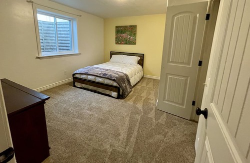If you are here supporting a loved one in an emergency situation, or healing yourself from a non-contagious illness, this is a home where you can find peace and support. It is affordable in this shared home! It is lovely! Fully furnished for all your needs! It includes a library, wireless internet, a smart TV in each room, two gathering rooms, privacy in your own code-locked room, and support of other guests, if you reach out. A garage space, personal cupboards & fridge, spices, kitchen needs, washer & dryer with laundry soap, a big, fenced back yard in a safe neighborhood.