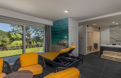 Villa "Visum Mare Tribus", 3 storeys. 500 m from the centre of Mošćenička Draga, in a sunny position, 700 m from the sea, from the beach. Private: property 1'230 m2 with wildlife garden, swimming pool angular, heated (9 x 4 m, depth 140 cm, seasonal availability: 15.Apr. - 30.Oct.). Outdoor shower. In the house: internet access, sauna, hot tub, central heating system, washing machine, tumble dryer. Parking (for 5 cars) at the house on the premises. Shop, supermarket 650 m, restaurant 100 m, bus stop 70 m, shingle beach, public bathing area 700 m. Swimming pool with counterflow.