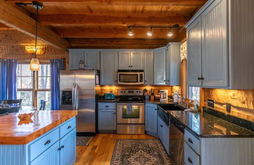 Enter Walk in the Clouds to find all the beauty of this cabin's surroundings echoed throughout the home with its classic mountain décor including hardwood floors, custom woodwork and comfortable furnishings. Through the front door you will find the modern kitchen fully equipped and ready for a memorable meal. It is complete with stainless steel appliances, granite countertops, and a beautiful island with a custom wood top.