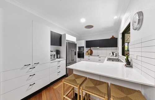 Uber tranquil & full of character is our 4 bed, 3 bath home. Flat easy walk to local beaches Alex Headland, Maroochydore, Cotton Tree & Mooloolaba. Space is abundant & perfect for families. Chill pool side & enjoy the outdoor alfresco over looking over the pool and rainforest. The outdoor area has it all. Large dining table, outdoor kitchen, couches and breakfast bar. Inside you will find 2 large living areas, modern kitchen, main bedroom with ensuite and separate kids zones with a table tennis table. The yard is fully fenced, 1/2 pipe skate ramp, trampoline, basketball ring, firepit & lot's of shade from the stunning rainforest canopy. Lounge the day away relaxing poolside, fire-up the bbq, make a drink whilst surrounded by nature. Hard to believe you're minutes to the beach!