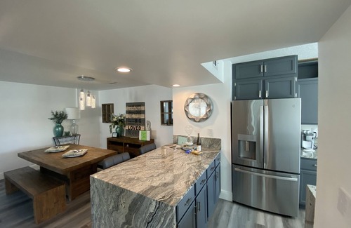 Upon entry, the main living area's 25' vaulted ceilings give this home an open feeling with lots of natural light. Kitchen has been newly renovated with an amazing granite island and counters, as well as Upgraded Stainless steel appliances. Home has dual Master suites. Upstairs Primary bedroom has vaulted ceilings, a king bed and expanded closet. Upstairs primary bath has been renovated for an elegant spa-like experience. Downstairs Master is set up with Queen size Murphy bed that doubles as a desk and office space. 3rd bedroom, downstairs has a full/double size bed. Upstairs loft has a futon that unfolds to another full size sleeper as well as a private 3rd floor balcony.