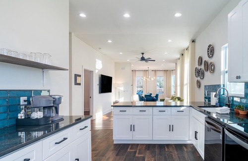The full-size kitchen is well equipped with an oven/stove, dishwasher, microwave, and refrigerator. A drip coffee maker, Keurig, teapot, and toaster and are also provided. The kitchen has all your baking and cooking utensils/equipment for you to start your next culinary dining experience!