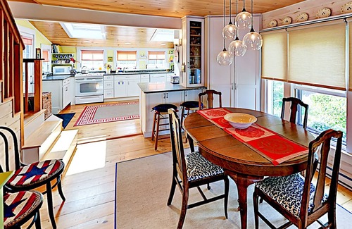 The light-filled and fully equipped kitchen provides ocean views to both the East and the West. Bring your group together around the vintage oak dining room table for memorable vacation mealtimes.