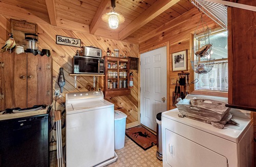 This riverfront home is ideally situated between Moosehead Lake and Brassua Lake on the Moose River that connects them. The rustic, log-cabin exterior conceals a truly unique interior - one that's full of exposed beams, lofty ceilings, and richly hued natural wood. To one side of the great room is a living area with ample seating, a flatscreen TV, and a glass door that connects to the screened-in porch. To the other side is a dining room table for eight, where you can share meals overlooking the river, and a kitchen with a peninsula breakfast bar, a stainless steel refrigerator, and an adjacent utility room that houses the washer/dryer.