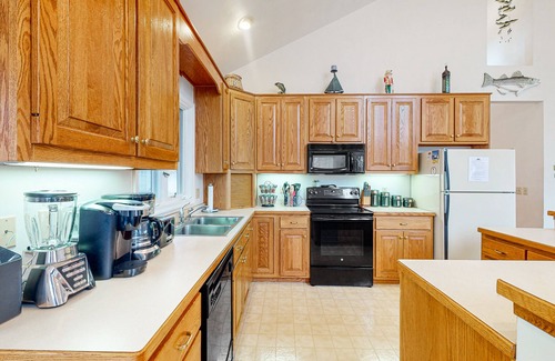 Cathedral ceilings and an open floor plan are featured in the great room of this comfortable lake home. The well-equipped kitchen with a breakfast bar and adjacent dining area allows seating for your whole group. This level also offers a lakeside primary suite with a full bath and a powder room. For entertainment, there is a pool table in the family room, a bar, a foosball table, an air hockey table, a Ms. Pac-Man 10-in-1 arcade, and electronic darts! There are also two additional lakeside bedrooms, a bath, and a bunk area on this level with a TV with DVD in each room. For families traveling with little ones, a baby stroller is available for your convenience—perfect for walks around the neighborhood or day trips. There is also a high chair available as well.