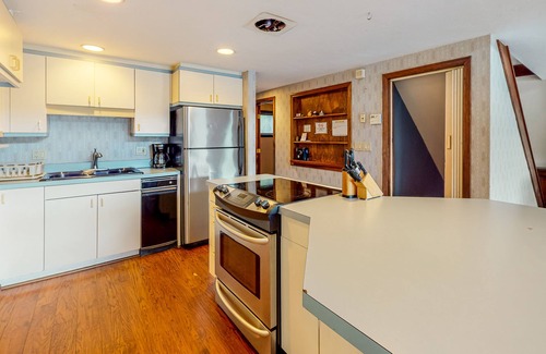 An exceptional stay awaits at this tranquil lakefront escape. With plenty of room for the whole family, this three-bedroom vacation rental comes equipped with all the comforts of home. Make the most of outdoor living on the spacious private deck or head down to the waterfront firepit for s'mores and starlight conversation. Interior highlights include vaulted ceilings throughout the common areas, a suspended, wood-burning fireplace, and ample seating for group gatherings. Enjoy casual downtime with shows and movies on the smart TV. At-home meal planning is a breeze in the well-appointed, full kitchen and the built-in dining counter offers seating for six. Home essentials include free WiFi and a private washer/dryer.