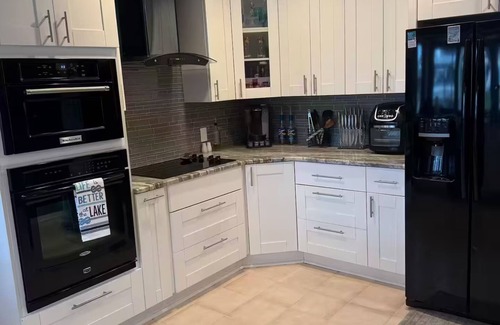 Kitchen: State of the art, large open kitchen with 42" cabinets, stocked with EVERYTHING you need for delicious home cooked meals! Granite counter tops, side-by-side fridge, ice maker and dispenser, filtered water dispenser, built in microwave, built-in oven, glass top cooktop, countertop air fryer, coffee station complete with coffee and sugar free syrups, food processor, electric mixer, electric peeler (super fun way to get little ones excited about eating fruits/vegies), pots, pans, utensils, silverware, placemats, and more! Not to mention the "Serving Hatch" passthrough double sliding window that opens directly to the pool! Imagine the ease of being able to make brunch for your family/friends while being able to clearly see and interact with them--comfort and safety! Some food, staples, spices, condiments, etc. have been provided - use what you want!