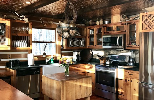 The cabin provides 4 bedrooms: 2 king beds - one king on main level with the second king on basement level, both beds have new Serta mattresses. The 2 queen beds are on the 3rd level. The main level king bed/bath has a claw foot tub and a shower. The ground level king bed/bath has a shower and there is a tub/shower bath on the 3rd level for the two queen bedrooms.