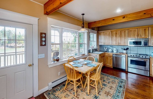 Designed for household living, the main floor features a stainless steel full kitchen, full bathroom, separate living and dining areas, and a furnished deck. Watch sunrise while sipping coffee on the deck or enjoy a waterfront breakfast at the four-seater table in the kitchen. Family meals can be enjoyed together at the dining room table set for six. The cozy adjacent sitting area showcases artifacts charting the community's regional heritage and photos documenting the home's historical restoration. After the day's adventures, unwind in the living room with shows and movies on the smart TV.