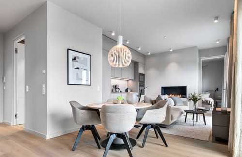 The heart of the apartment is the open-plan living area, featuring a high-quality SieMatic kitchen and a stylish dining area. Here, you can prepare culinary delights and enjoy them together at the dining table. The cozy living area, complete with a sofa, Smart TV, and ethanol fireplace, invites you to spend relaxing evenings. Enjoy the warmth of the fireplace and reflect on the day.