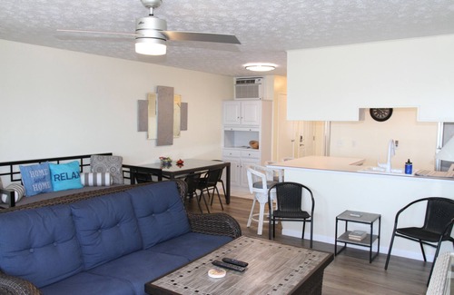 The only thing between this condo and the water is a nice grassy area and the break wall. This condo is clean and almost everything is new, including new flooring throughout and furnishings, 60" flat screen TV, kitchen supplies/equipment, towels, linens and more!