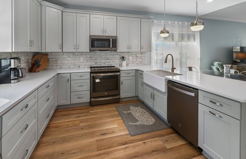 As you enter “Watershed Cottage” you'll be greeted with a light and airy living/dining kitchen area with lots of custom touches. This open concept kitchen/dining/living area has beautiful luxury vinyl plank flooring, new furniture, and a 55-inch smart tv. The luxury kitchen features Quartz countertops, new stainless steel appliances, an oven with a built-in air fryer, and a breakfast bar (seats 4) and overlooks the dining area with seating for 6. The private master suite features a king bed, 42” smart tv, and a barn door leading to the master bathroom. The luxury bathroom has a custom tile shower with seamless glass doors. Both guest bedrooms feature a queen bed, and a 32” smart tv. The guest bathroom spotlights a custom-tile shower with seamless glass doors.