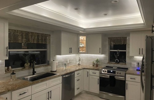 Our entire living area, sunroom, dining room, kitchen and living room, has an open floor plan that allows everyone to be involved in the conversation. The large sunroom has 2 desks for work (if you have to) or puzzles and crafts and opens out to the pool. The attractive coastal furniture is a great place to read a book or enjoy the tropical views. The backyard has beautiful artificial turf.