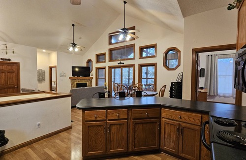 The open living area features vaulted ceilings and a gas fireplace, creating a warm and inviting space, especially during cooler seasons. The downstairs area has two additional bedrooms and a sleeper sofa, making it ideal for families or groups.