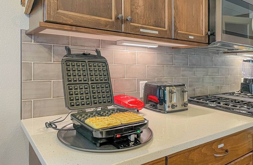 The primary bedroom is the perfect spot for working remotely, or not, with a large desk and an additional charging station. It also has speakers that can be hooked in to your phone or laptop. The mattress is a Hybrid, medium-firm. In the spacious primary bath you will find double sinks and a walk in shower as well as a tub/shower combination in the hallway bath.