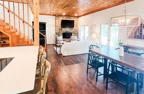 Comfortably sleeps 15 in beds. Max occupancy is 15. Master bedroom with King bed on the main level. Another Full bath off the living room. Upstairs you’ll find a queen bedroom, king bedroom, hall bath along with a kid/teen hangout room with 4 built in bunk beds- 2 twins & 2 twin XLs. Walk up the stairs to the guest house for 2 more bedrooms & full bathrooms! One with a king bed and one with a queen & twin. More photos coming soon!
