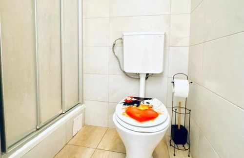 The shared bathroom is stocked with fresh towels, premium toiletries, and features a modern shower to ensure a refreshing experience.