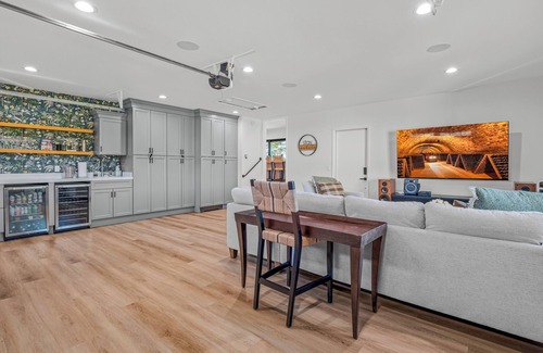Head to the bonus room, equipped with a 75" TV, comfortable seating, karaoke machine, wet bar (no booze included =) ), ping pong table and laundry closet. The attached garage is not available for parking vehicles, however, there is ample parking in front of the private access home. The additional stand-alone garage is used for owner storage and is not made available to guests. You will find LED ambient lighting accenting throughout the entire home, providing warmth and comfort to set the mood.