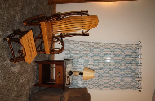 On the first floor we have a kitchen, living room,bathroom and 2 bedrooms. One bedroom has a queen sized bed and the other is a crib and a toddler bunk bed. In the basement there is another bedroom with a queen bed, an open room with a curtain to close with a full sized bunk bed, a bathroom and Landry. There are 2 decks, a big yard and a comfy swing in the pines to relax in!