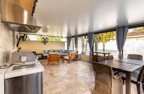 Outdoor Oasis with a Mont Alpi stainless steel outdoor kitchen, Pottery Barn furniture, travertine pavers, high-end cooling mist system, and heated/cooled saltwater pool.
