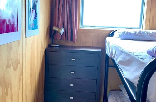 There is also a sleepout (The Palace) which contains one room with a queen bed in it. It is attached to an outdoor area (a roofed in deck) with a table and chairs to relax. See pictures. This can only be rented with one or both of the houses. POA.