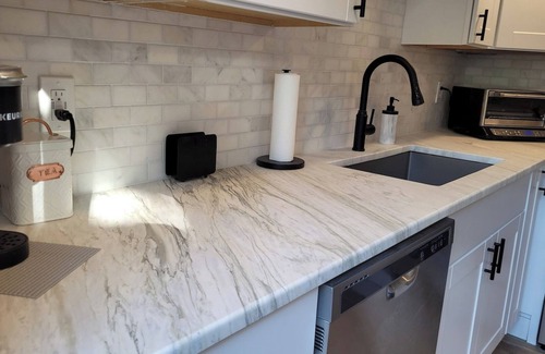 -The kitchen is beautiful with stone countertops, ample cabinets, new stainless steel appliances and all the features you will need to prepare meals.