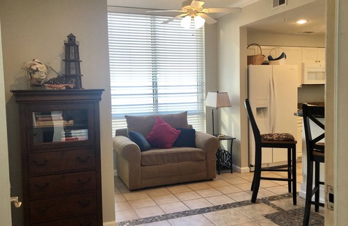 This condo has been renovated (wasted entry foyer walls REMOVED!) to provide open flowing living area from the entry door through the kitchen, dining area and family room, all the way to the Gulf front balcony. Very open kitchen/breakfast area with lots of extra space including a twin sleeper sofa with views of the Navarre Pier.