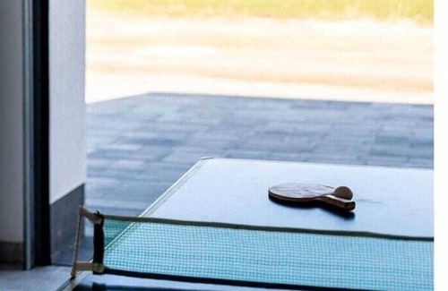 Layout: Ground floor: (hallway(Mirror, Wardrobe Coatrack, heating), open kitchen(Mirror, Mixer, Pool Table, Sofa, Spices, Sun Umbrella, Tea Towels, Kitchenette, toilet, Table tennis, TV, dining table, fireplace, fireplace, hob, hob, electric kettle, toaster, cooker, coffee machine, oven, grill, microwave, dishwasher, fridge, freezer, bath tub, shower, washbasin, washing machine, heating, changing mat, high chair, toys, Swing set), bedroom(Bed Linen, Wardrobe, double king size bed(200 x 180 cm), TV, cot, heating), bedroom(Bed Linen, Wardrobe, double bed, TV, cot, heating), bedroom(Bed Linen, Wardrobe, double bed, TV, cot, heating), bathroom(Mirror, toilet, bath tub, shower, washbasin, heating), storage(Vacuum Cleaner, tumble dryer, washing machine, heating, ironing board, iron, drying cabinet), lounge set(Pool Table, Table tennis, heating)) Fire Alarm, Hot Water, Internet Access DSL, Vacuum Cleaner, Internet access, Internet access, washing machine, heating, terrace(Sun Umbrella, garden furniture), terrace(Sun Umbrella, garden furniture), garden(Barbecue center, Lawn, garden furniture), ironing board, iron, drying cabinet, parking (paying)