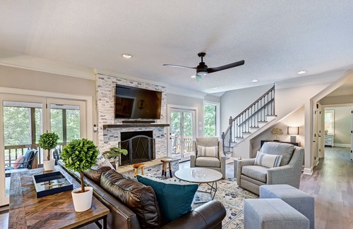 This gorgeous home features 7 bedrooms that sleep 16 and 5 and a half baths! With bedrooms on all 3 levels of the home, it offers both comfort and convenience for your group. On the main level, a master bedroom with a full bath, a queen suite, and a king suite, all featuring large plush bedding and pillows for a restful sleep. You will be right at home while feeling relaxed and pampered. The upper level features luxurious sleeping areas include 2 king bedrooms, one with en suite bathroom, and a bunkroom. The bunk room is perfect for the kids, with two Twin over full bunk beds that sleep 4, and a TV. Need some alone time? Hide away in the cozy reading nook upstairs and get lost in a book!