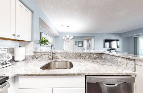 Step inside, and you will be greeted by tasteful beach decor, calming blue accents, and a spacious layout allowing everyone to spread out. When you work up an appetite, hop into the full kitchen boasting a stylish subway tile backsplash, granite countertops, stainless steel appliances, and all the utensils needed to show off your culinary skills to the whole family. Plus, the living area features furniture that includes sofas and a large TV to host movie nights that everyone will enjoy.