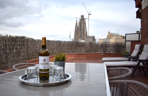 This modern 7th floor open plan apartment in the Eixample area is finished and decorated to a high standard - only a few minutes walk from the Passeig de Garcia,Barcelona's chic and most famous boulevard. The main living area has the benefit of air conditioning, TV, DVD and leads to a large terrace with incredible views over the Sagrada Familia, which is just a minutes walk away.