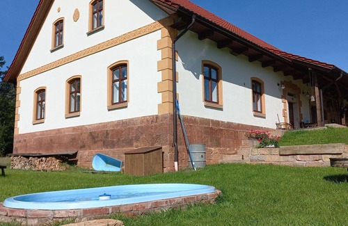 The property is a luxurious farmhouse built in 1868 and renovated in 2021, located in Dolní Olešnice, 7 km from Hostinné. It features a private swimming pool (2 x 4 m, depth 120 cm, seasonal availability: 01.Jun. - 30.Sep.), a terrace, garden furniture, a barbecue, a fireplace, and a children's playground with a sandbox. The holiday rental offers amenities such as Internet WiFi, a table tennis table, a billiard table, a table football game, a trampoline, and a washing machine. Parking is available at the house, though the motor access is steep, with a distance of 50 m from the grounds.