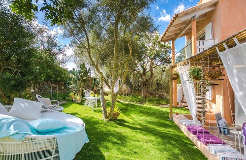 Sa Font is a very beautiful and comfortable farm estate in Vilafranca De Bonany, Spain. This renovated two-story property offers a yard, Internet WiFi, and parking. Surrounded by meadows and located in a quiet position on top of a hill, it provides a natural setting with a wildlife garden and trees. The vacation rental features a beautiful garden to relax, an outdoor shower, hot tub, patio, arbour, garden furniture, and a barbecue.