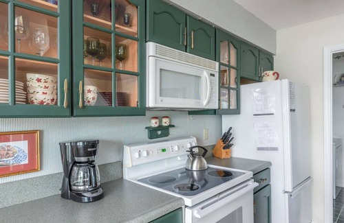 The living room is the perfect place to gather after a long day, offering a flat-screen television with a DVD player and plenty of seating. Enjoy cooking in the fully-equipped kitchen, including both large and small appliances for your convenience. Dine as a group at the four-person table with additional seating found at the counter. A charcoal grill is also provided for your convenience.