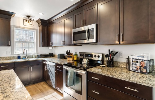 Step into your cozy retreat with an open living area offering a spacious couch, leather chair, and a smart TV. While we don’t offer cable, each TV is equipped with built-in Roku for watching all of your guilty pleasures. Go ahead, binge-watch your favorite show, no judgment here! The kitchen is stocked with cookware, a Keurig coffee maker, and some of our favorite cookbooks. A convenient half bathroom houses the washer and dryer, while the pantry is stocked with board games and cards for your entertainment.