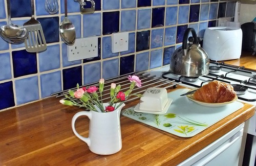 The kitchen has a 4 ring gas cooker, oven and grill, fridge/freezer, microwave, dishwasher, kettle all the usual utensils and crockery. There is also a pull out dining table with stools. There is access to laundry facilities in the barn should you require use.
