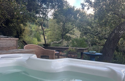 Whether you are vacationing from afar, escaping San Francisco summer fog, or tending a nearby remodel, you will feel like you are on vacation in this home. It is located on one acre, up a private drive, surrounded by oaks and redwoods and is the perfect place to relax. The property is located in the heart of central Marin, walking distance to the villages of San Anselmo and San Rafael where you can enjoy cute cafes and shops. The house has a living room with cathedral ceilings and floor to ceiling windows, formal dining room, fully equipped kitchen, 3 decks with garden views, 3 bedrooms, 2 bath. The master bedroom has a king bed with view of the valley, the 2nd bedroom has a queen futon with private deck overlooking the garden, fireplace and flatscreen TV. The third bedroom has a twin bed, private full bath, and a separate deck to the hot tub area. This space also makes a perfect office. There is a hillside garden terrace with fruit trees and a 3-4 person hot tub overlooking a beautiful view.