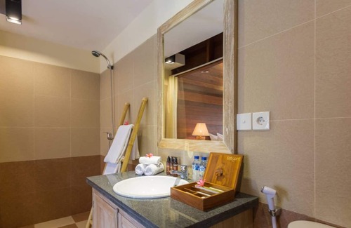 We are offer deluxe rooms en-suite bathroom are Joglo house within a collection of single building and has private terrace or balcony facing the pool view. The look embraces tropical simplicity with white-washed timber finishes, comfortable furnishings and a queen sized bed fitted with high quality cotton linen. There is also an 29" LED TV with DVD player for in-room entertainment. The spacious bathroom comes complete with a marble, separate shower and bathing amenities.