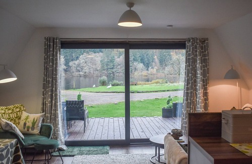 Shower Room: Walk-In Shower, Toilet. Electric central heating, electricity, bed linen, towels and Wi-Fi included. Travel cot and highchair available on request. Welcome pack.. Decking with sitting-out area, garden furniture and BBQ. Fly fishing on-site. Private parking at on-site car parks; unloading at the door. No smoking. Please note: There is a loch 50 yards from the property.. This Scandinavian, A-frame log cabin sits on the banks of Loch Oich, is all on one level and sleeps up to six guests. There is an open plan living, dining and kitchen area which opens out to a private decking with loch and mountain views. Pine Needle Lodge has been completely refurbished to a high standard. Due to the remote location and surrounded by mountains there is no TV in the chalet, USB ports are in all the rooms too.
