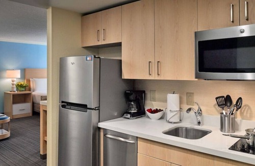 - Kitchen with a refrigerator, stovetop, microwave oven;