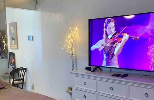 This is a lovely updated modern Zen decor. This space is available with either a king bed or two twin beds based on your needs. With some wonderful art pieces. Very comfortable and cozy lots of natural light all the comforts of home with a kitchenette if you feel like staying in and enjoying the 60 inch TV and cooking yourself a little something. Also a double sink bathroom brand new updated bathroom and a very soothing cream colored marble and white tones with lots of art. Namaste and welcome