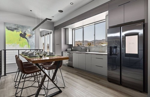 Just five minutes from Indian Cove — one of Joshua Tree National Park's best-kept secrets — sits Zenith, an architectural gem that rises from the striking desert landscape. The geometric two-story design affords elevated views of the natural beauty in all directions, with a wraparound balcony for enjoying it all in the open air. Inside you'll find a neutral color palette and minimalist décor that echoes the quiet calm of the desert, while the outdoor space is a private oasis complete with native plants, chic lounge chairs, and an inviting pool for cooling off and soaking up the sun. A chef's kitchen, upstairs and downstairs lounge areas, and a garage game room provide plenty of inviting spaces for sharing moments with your group.