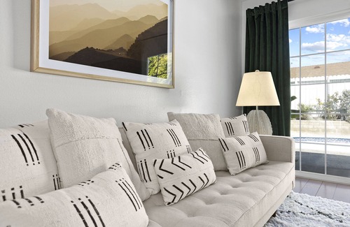 The location is a single-story, ranch-style home with a large pool in a sunny, private back garden. The pool, heated by solar panels**, is perfect for swimming laps or just floating in the sun. Lounge chairs surrounded by greenery will make you feel like you’re living in a private, sun-drenched spa created just for you.